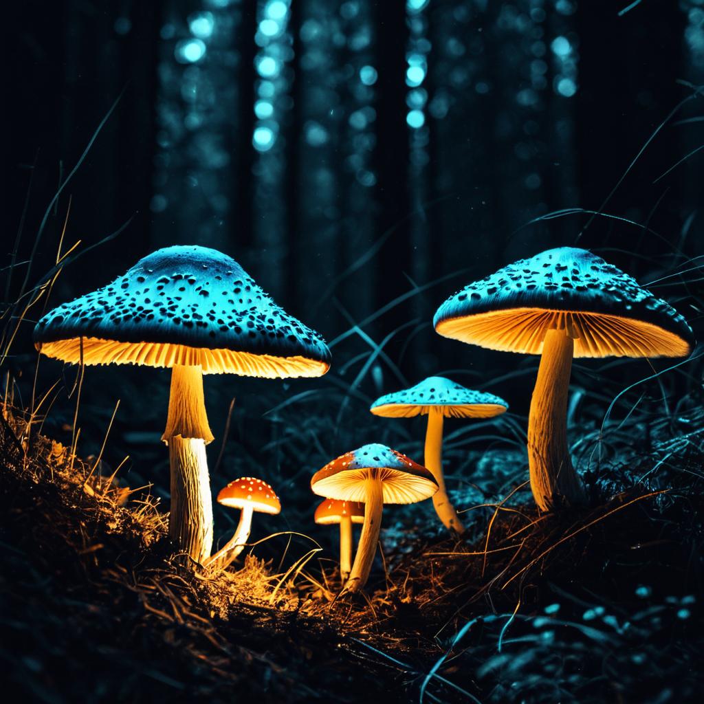 Digital artwork of glowing mushrooms in a dark forest illuminated with vibrant neon colors. The mushrooms emit shades of blue, purple, green, and orange light, creating a magical and surreal atmosphere. The forest background is dimly illuminated with a glowing blue path winding through the scene, enhancing the mystical feel. Rendered in a vibrant MSPaint style.