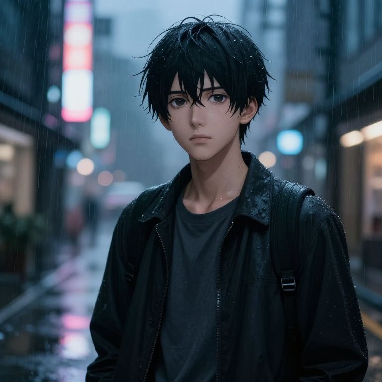 Realistic anime art portraying a young protagonist in a rainy cityscape, detailed wet textures on clothes and skin, reflective surfaces, mood lighting emphasizing raindrops and glow from neon signs, combining traditional anime stylization with hyperrealistic effects.