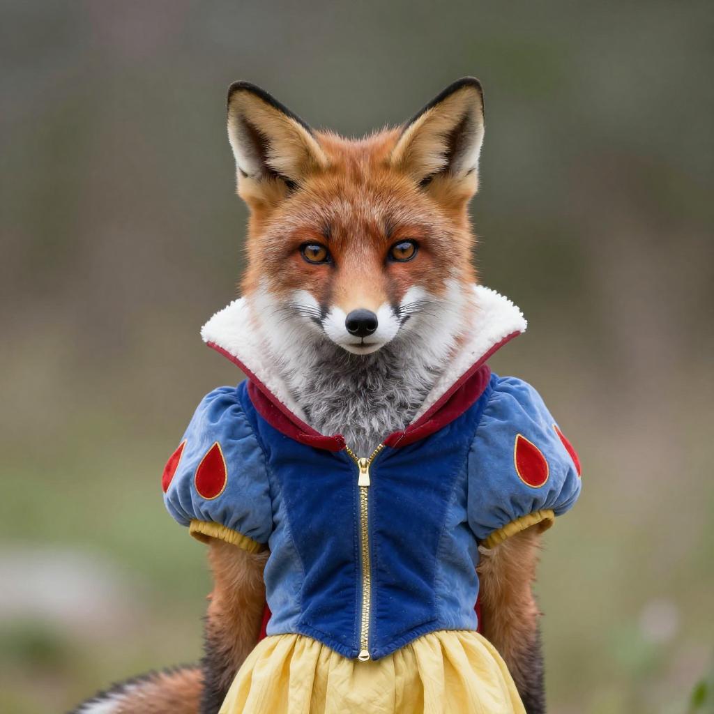 Realistic photo. Fox dressed as a Snow White posing for an image, whimsical and playful. realistic photo
