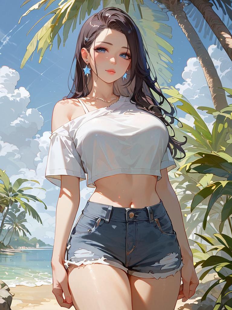 Digital artwork of an athletic young woman with long dark hair accented with blue highlights, wearing ultra-short distressed high-waisted denim Daisy Duke shorts and an off-the-shoulder white smocked crop top. She stands confidently on a coastal path lined with palm trees and tropical plants, with the ocean and a rocky shoreline visible in the background under bright golden-hour sunlight. She wears a loose blue jacket slipping off her shoulders, and has bright blue earrings and hair accessory. The scene captures cinematic summer street-style fashion in high resolution.