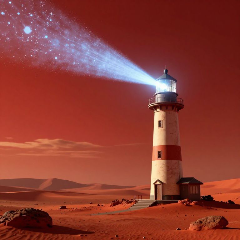 A cyberpunk-inspired 3D render depicts a futuristic lighthouse on Mars, projecting a radiant beam of crystallized light into the crimson sky, guiding unseen orchestras through the desolate red dunes under dramatic golden-hour lighting.
