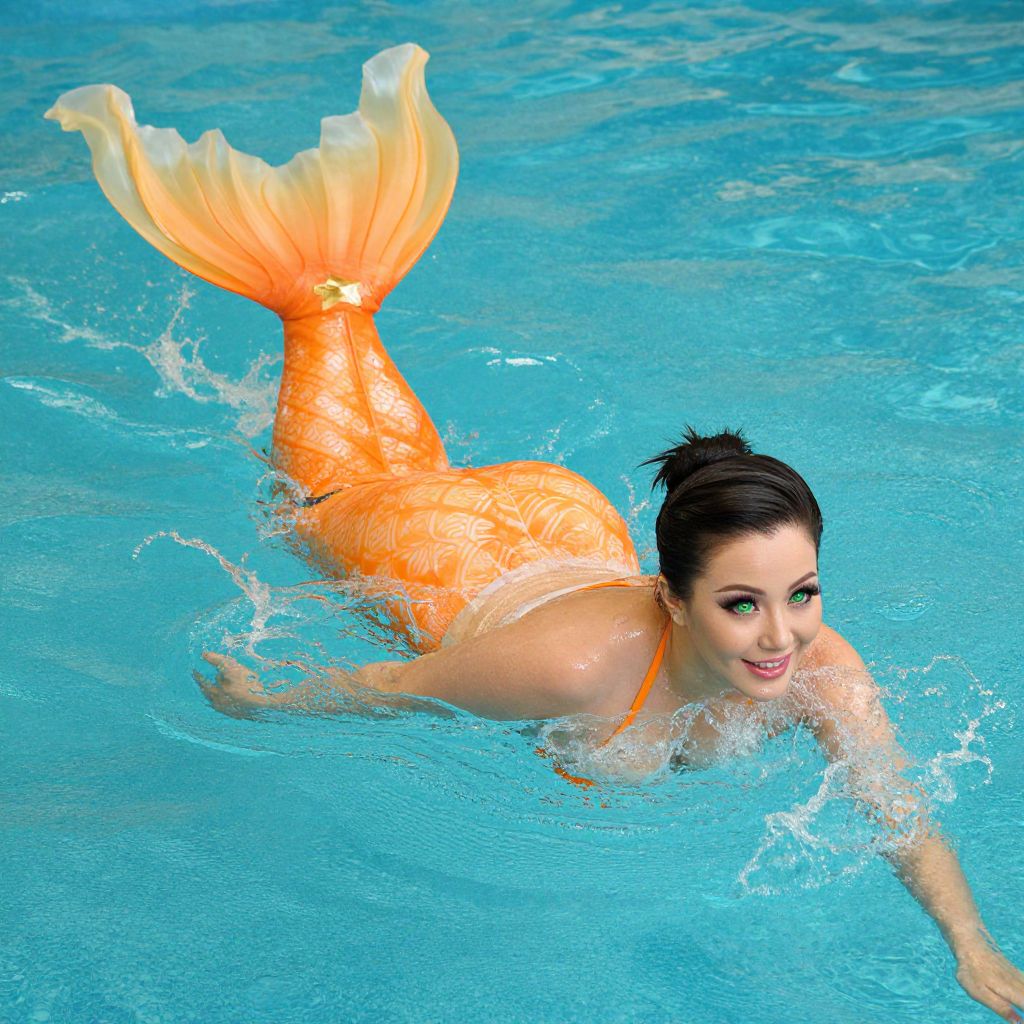 A dynamic shot of a woman mid-swim in a turquoise pool, wearing an orange mermaid tail costume with flowing, slightly translucent fins and a small golden star motif on the tail, surrounded by playful splashes and water ripples, her face smiling confidently with bright green eyes.. The woman has big breasts and cute face