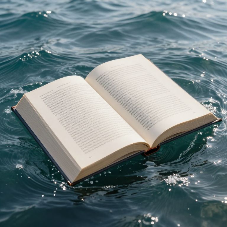 Giant open books float serenely above turbulent ocean waves, their pages filled with dense text that seem to ripple and flow like the sea beneath them.