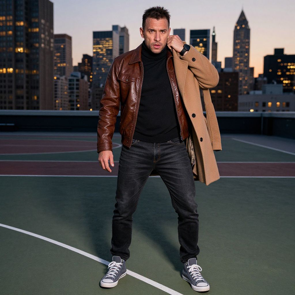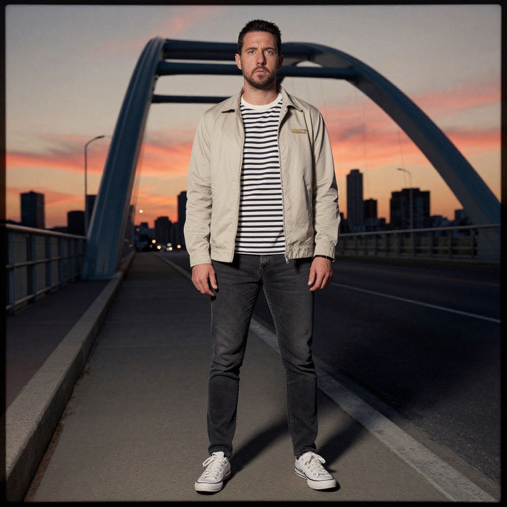 Photograph of a serious, muscular man in a neon yellow jacket, black shirt, gray shorts, and yellow sneakers, standing in a bustling city street