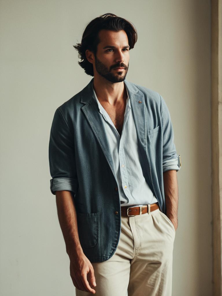 Portrait of a young man with dark hair and beard, wearing a light blue shirt, a casual blue blazer with rolled-up sleeves, beige pants, and a brown leather belt. The image features a relaxed and stylish summer casual look with a neutral indoor background.