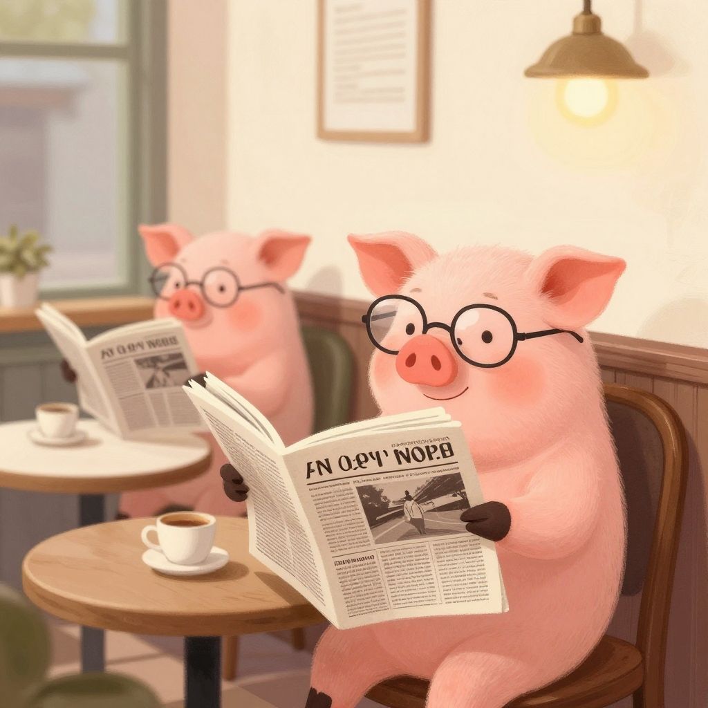 Whimsical Pigs Reading in Cozy Cafe