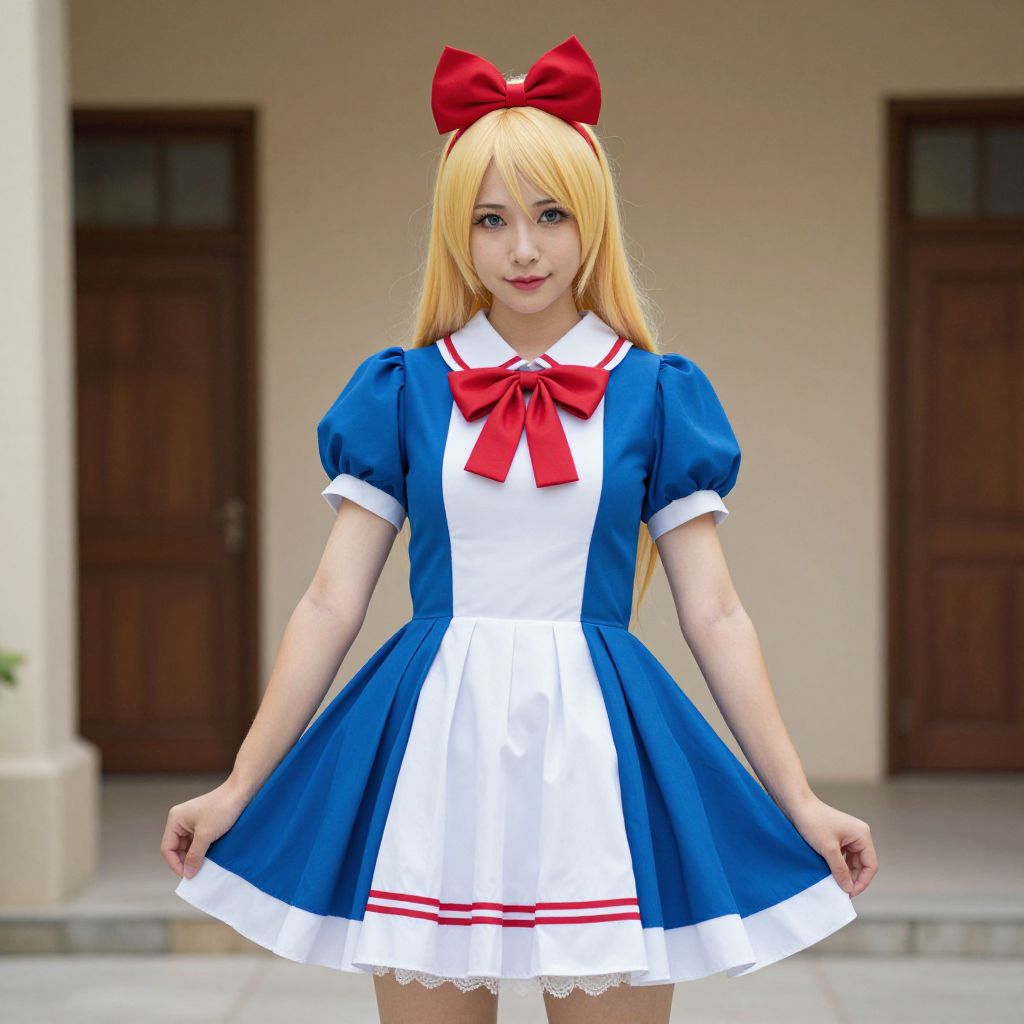 Photograph of a young woman with long blonde hair, wearing a blue and white Alice in Wonderland-style dress with puffed sleeves and a red bow at the neck and on her head. The dress features red stripes at the hem and lace trim. She stands outdoors in front of a beige building with two wooden doors, slightly smiling, with her hands holding the sides of her skirt. Her fair skin contrasts with the vibrant colors of her outfit. The image has a soft, slightly blurred background, emphasizing the subject.