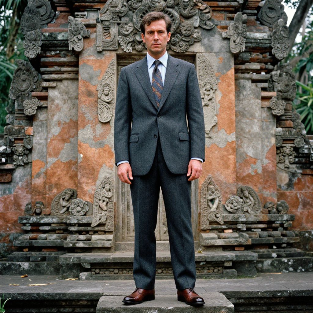 A man, charcoal gray pinstripe suit, lightweight wool fabric, light blue dress shirt, patterned silk tie, brown leather Oxford shoes, ancient stone temple, intricate carvings, surrounded by lush greenery, technicolor analog film stock, confident expression. Man has masculine face and piercing eyes