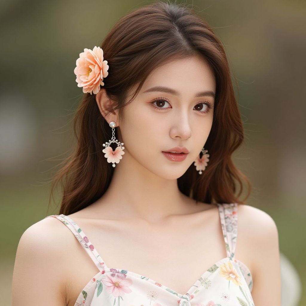 "blossoms costume, 1girl, solo, earrings, jewelry, chinese clothes, flower, looking at viewer, hair ornament, brown hair, hair flower, dress, upper body, realistic, china dress, floral print Realistic photo of casual sexy person with pretty face"