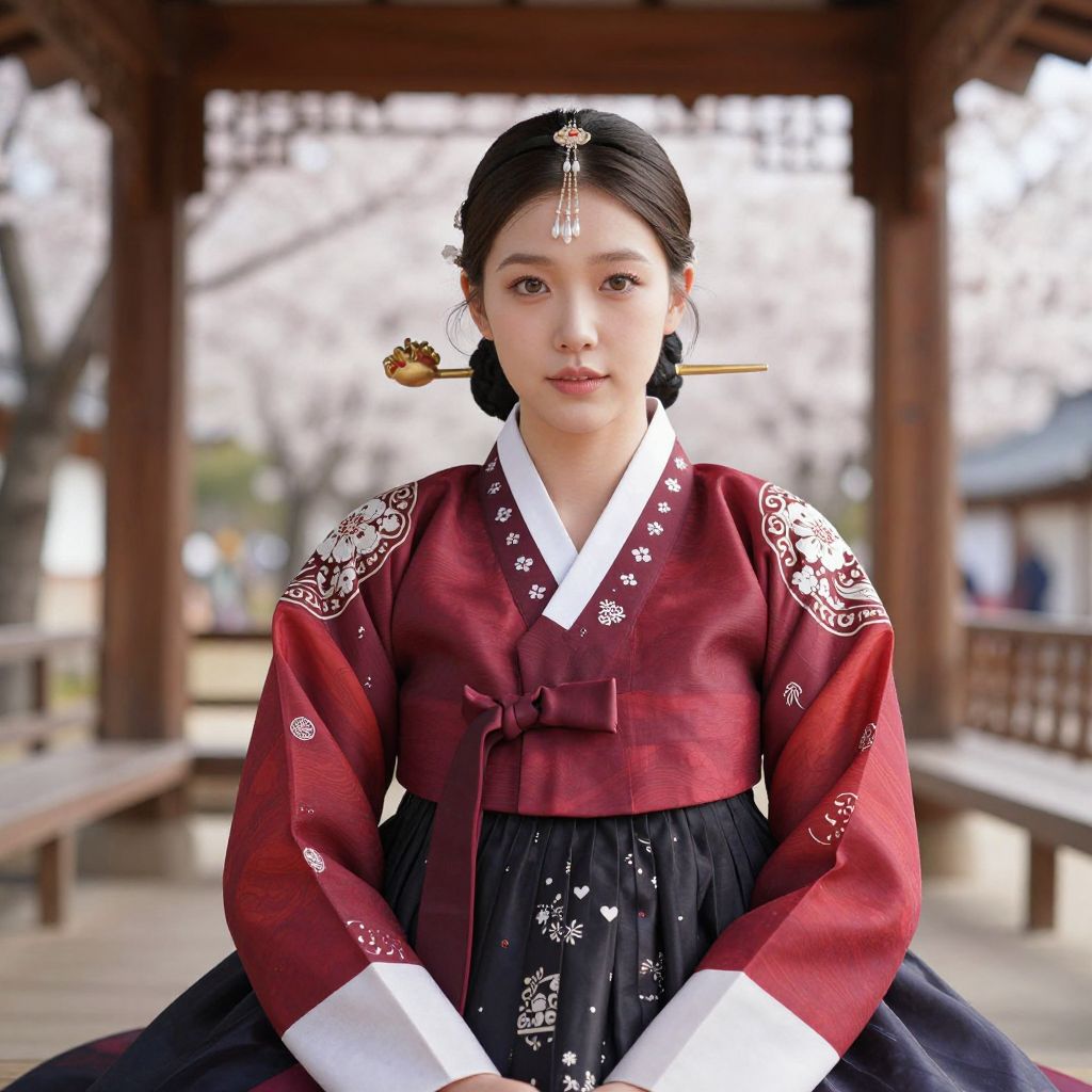 A poised and elegant woman in her late 20s with fair skin, hazel eyes, and a refined facial structure wearing a sumptuous traditional Korean hanbok with deep red and black patterns, sitting in a traditional wooden pavilion with cherry blossoms in spring, soft natural lighting, high-resolution realistic photography. The woman has big tits and cute face