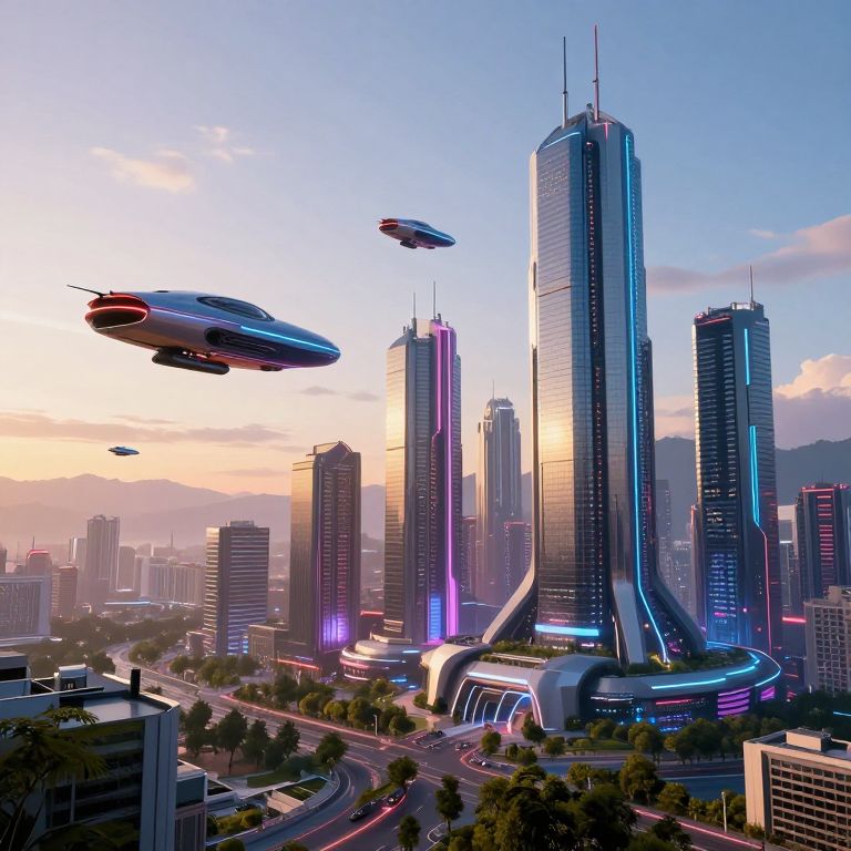 Photorealistic CGI of a futuristic cityscape at sunset, featuring towering skyscrapers, flying cars, and neon lights, with a busy road below