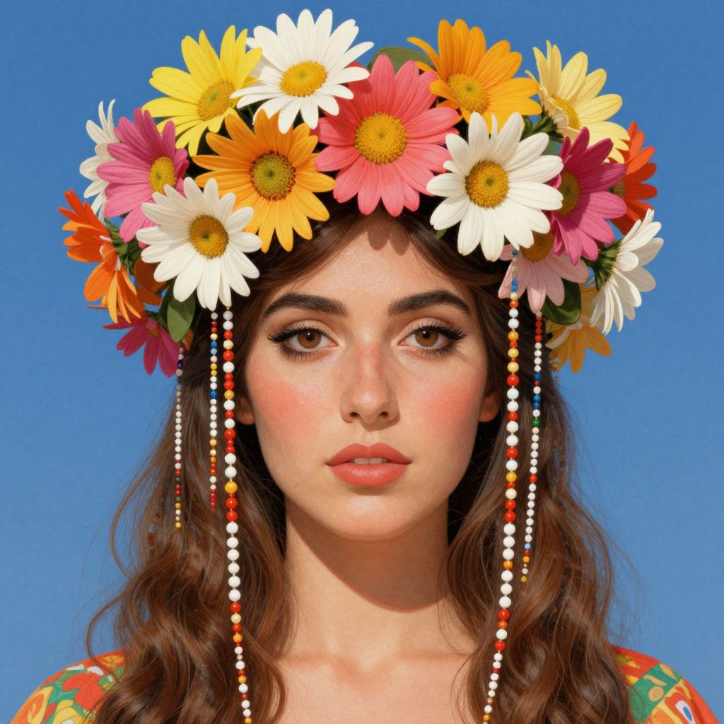 A vibrant digital illustration inspired by Spanish Magical Realism, featuring a woman adorned with a floral crown of colorful daisies and cascading beads, rendered in a high-definition, fantastical style reminiscent of Chelín Sanjuan's 1967 artwork.