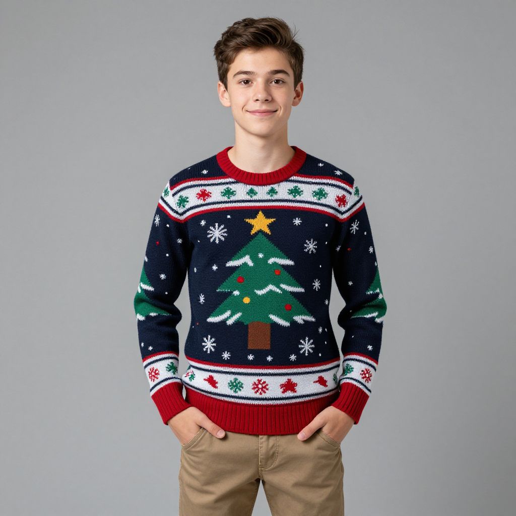 Photograph of a young boy with short brown hair, wearing a festive navy sweater with Christmas tree design, red cuffs, and beige pants, standing against