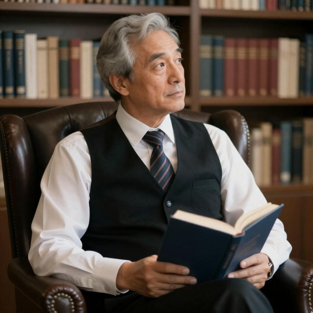 Middle-aged man with gray hair, wearing white shirt, black vest, and striped tie, sitting in dark leather armchair, holding blue book, looking to the right, bookshelf with books in background.