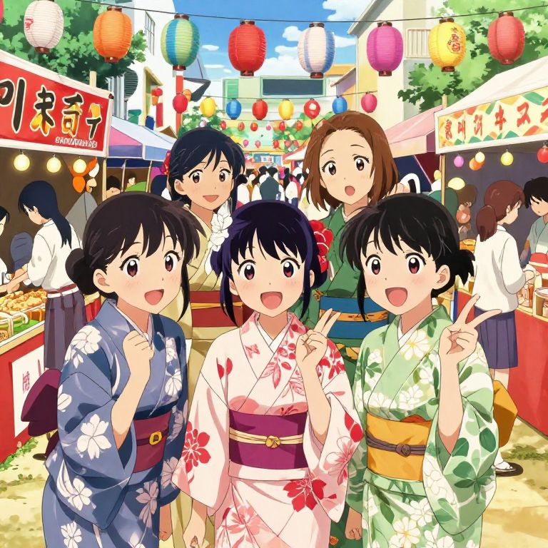 Anime-style illustration of five smiling Japanese girls in colorful kimonos at a vibrant festival with lanterns, food stalls, and busy crowd.