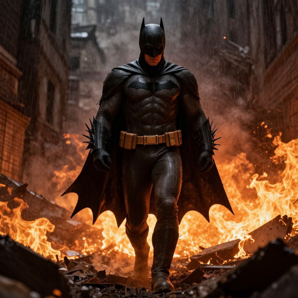 Batman walking through fire, apocalyptic inferno lighting up a ruined Gotham, fiery ashes falling like rain, detailed costume charred at edges, fierce gaze, slow-motion effect capturing movement of flames and cape, gritty dark fantasy atmosphere, sharp contrast highlights.
