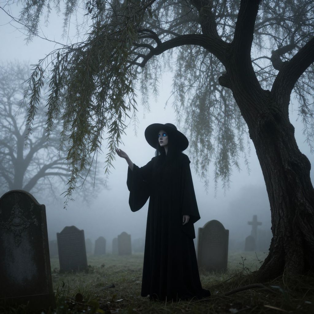A hauntingly beautiful portrait depicting a spectral figure with piercing blue eyes beneath a wide-brimmed hat. Seen from a low angle, we observe the ghostly silhouette standing amidst a foggy graveyard, casting an ethereal glow over the weathered tombstones and gnarled tree branches that claw at the somber sky. This mysterious being, both alluring and unsettling, exudes an air of melancholic curiosity as it reaches out towards a lone willow tree, its silhouetted leaves gently swaying in an unseen breeze—a captivating fusion of sorrowful elegance and macabre wonder.