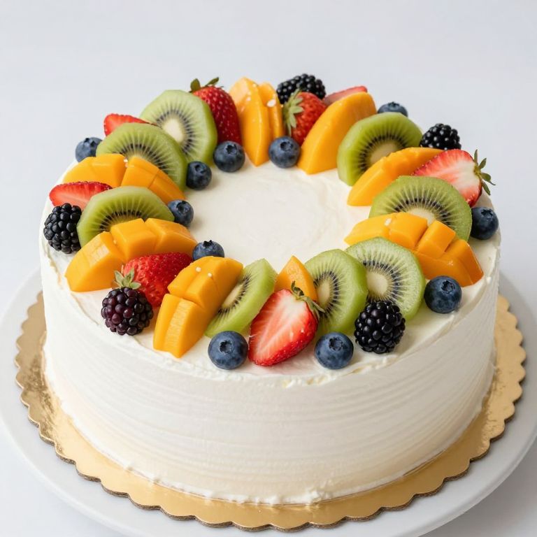 Colorful fruit-topped wedding cake featuring vibrant slices of mango, kiwi, strawberries, blackberries, and blueberries arranged in a sunburst pattern atop smooth white icing, presented on a scalloped gold base and white plate.