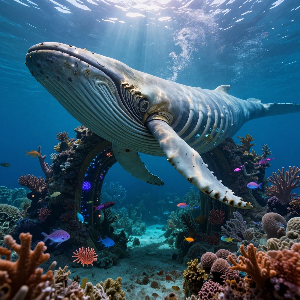 Photograph of a massive blue whale gliding through a vibrant, underwater coral reef, surrounded by colorful fish and sunlight filtering through the water.