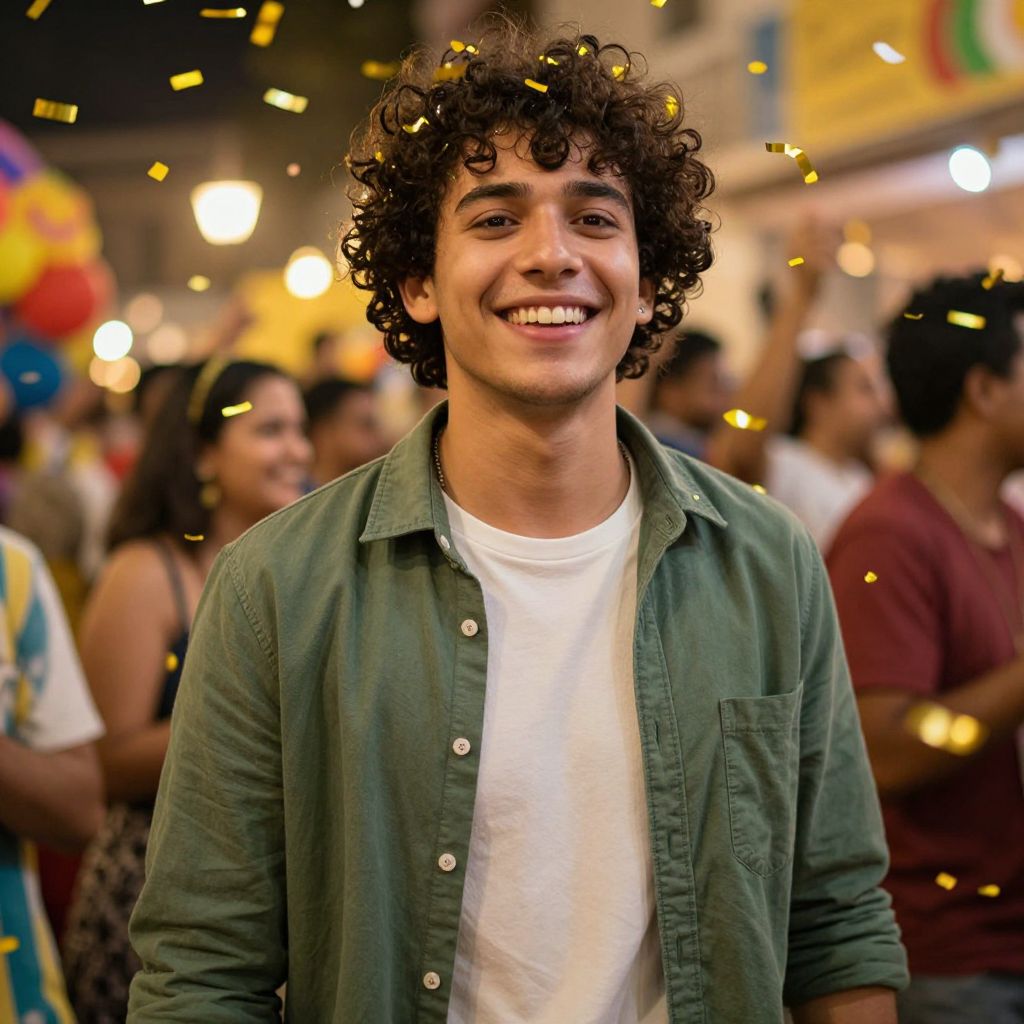 Photograph of a young man with curly dark hair and a broad smile, standing in a lively, colorful celebration. He's wearing a green, button-up shirt over a white t-shirt. Confetti is falling all around him, creating a vibrant, festive atmosphere. Blurred people and warm, yellow lights are in the background, adding to the energetic vibe.
