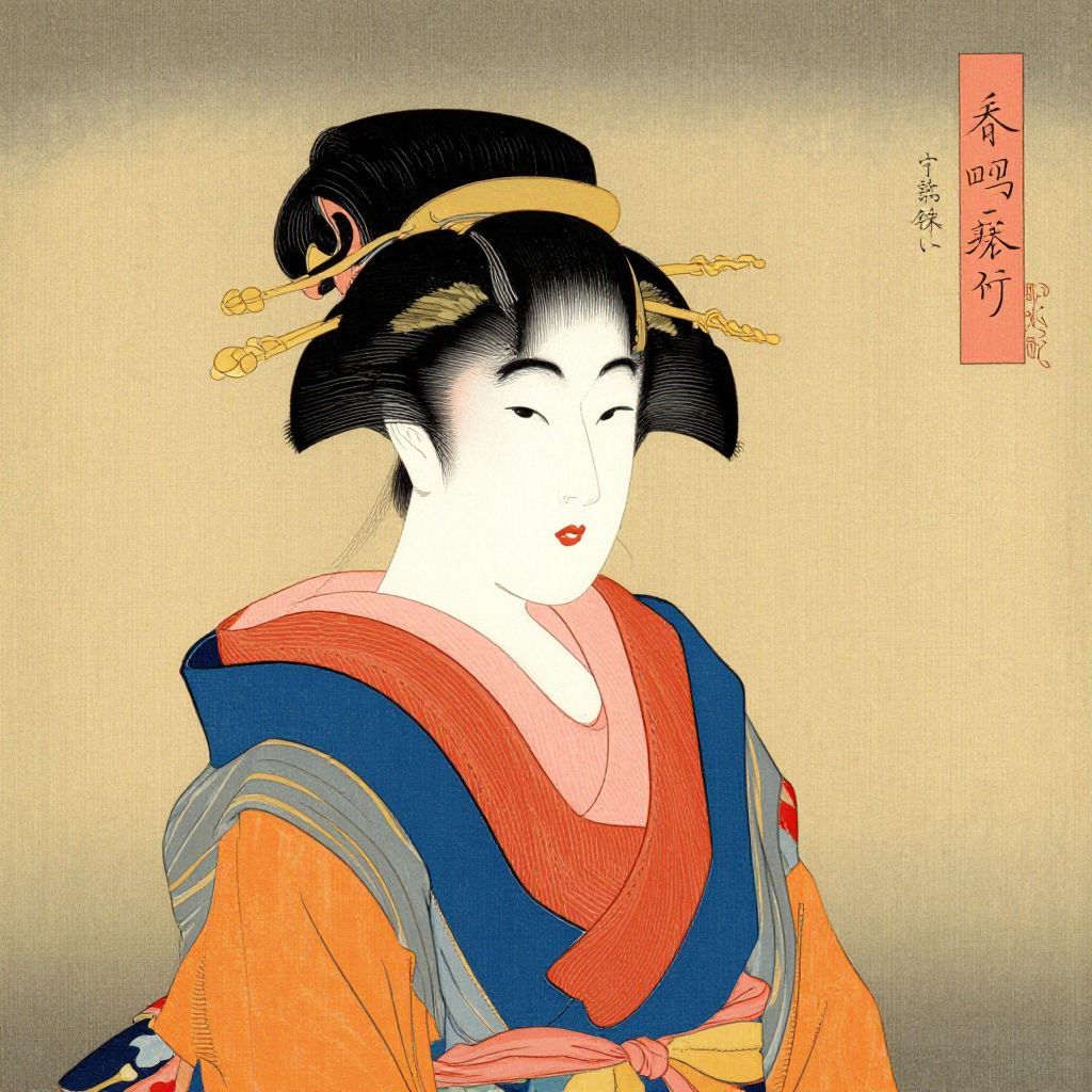 Ukiyo-e style artwork by Utagawa Kuniyoshi depicts a serene woman with dark hair styled in an elaborate updo adorned with gold hairpins, wearing a striped kimono with vibrant hues of blue, red, and orange, set against a warm, textured background with Japanese text in the upper right corner.