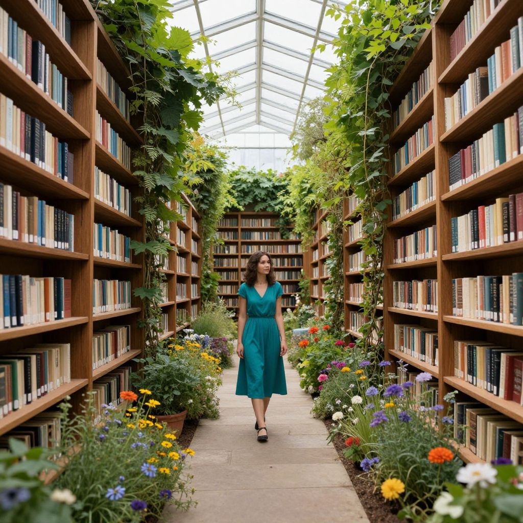 A woman in a teal dress stands amidst a serene library garden, surrounded by towering wooden shelves filled with books, vibrant green vines climbing the walls, and colorful wildflowers blooming along a stone pathway that stretches toward a luminous glass ceiling.