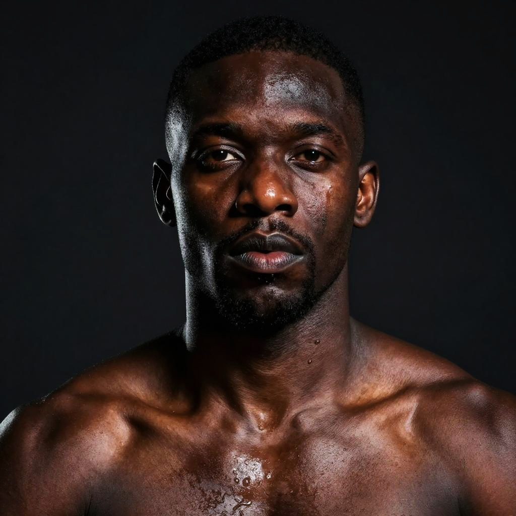 Portrait of a big oily black man with a shiny skin glow, dramatic studio lighting, strong presence, deep shadows, hyper-realistic detail, artistic expression