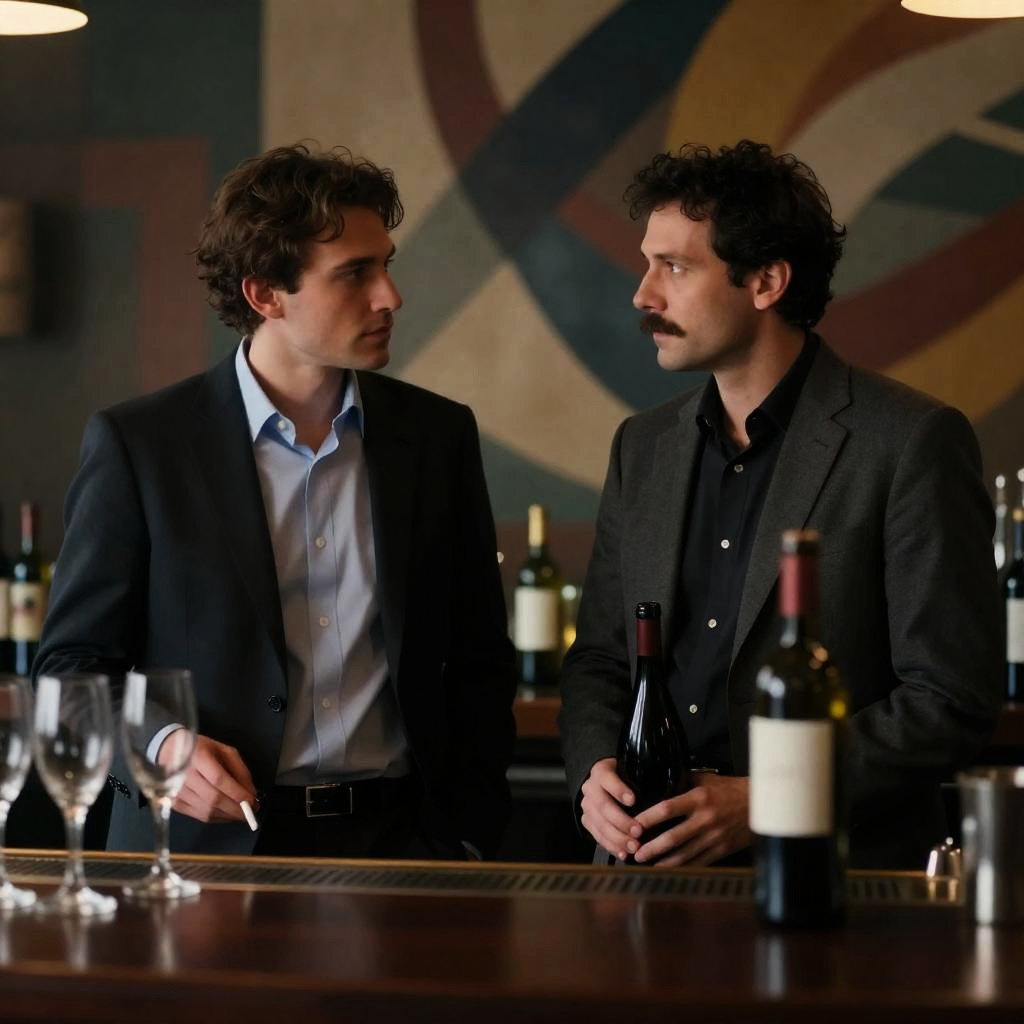 Man with short, light brown hair and beard, wearing dark brown shirt and blue jeans, stands in front of brightly lit wine shelves, holding a cigarette to his mouth, looking slightly to the side. Background: numerous bottles of wine on illuminated shelves, small window reflecting greenery. Casual, relaxed pose.