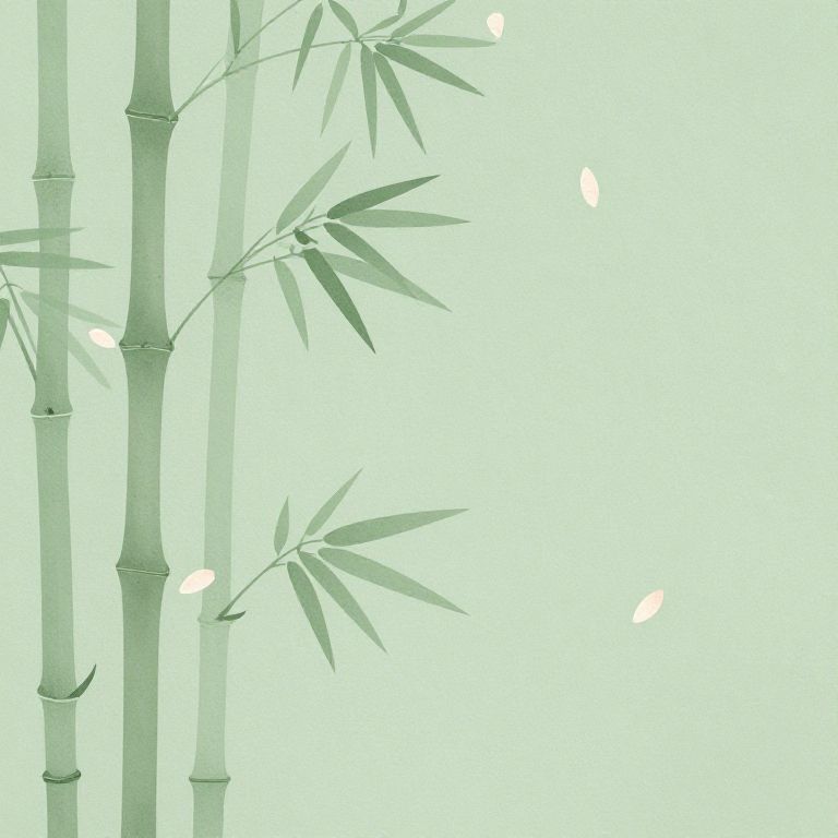 Digital art of four green bamboo stalks with slender leaves, set against a light green background. Small white leaves float. Minimalist, serene style.