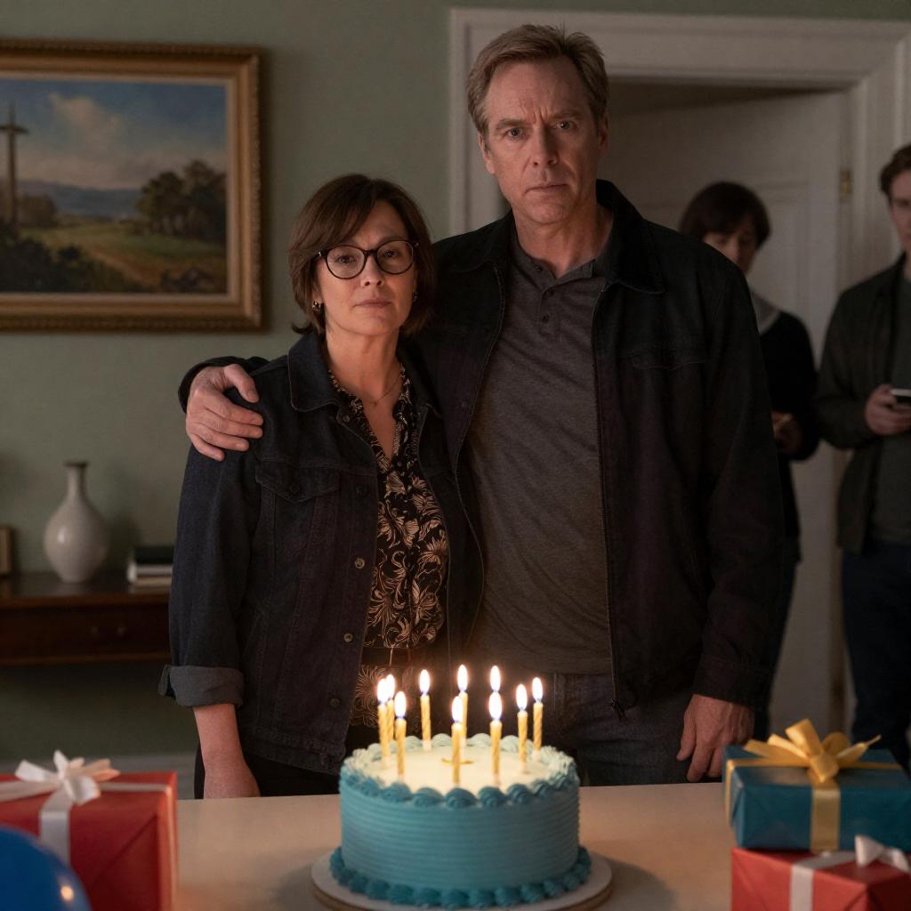 Photograph of an emotional embrace between an older woman with short brown hair and glasses, wearing a black top and white scarf, and a man with short brown hair in a white shirt. Blurred background with city lights. Another person in the left background. Intense, close embrace.