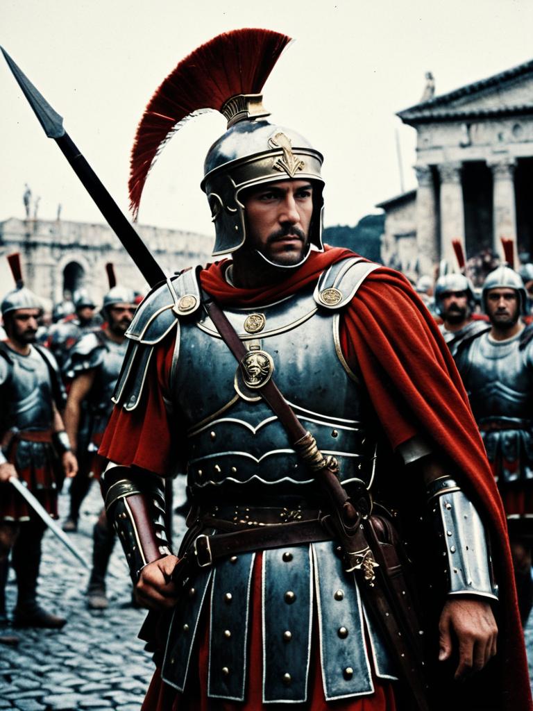 Man in Roman Soldier Costume, cinematic realism, dramatic historical photo