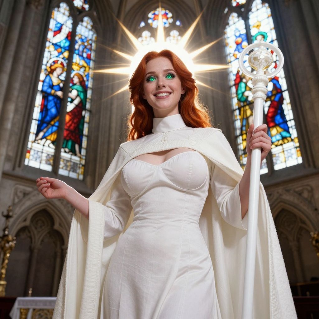 Score_9, score_8_up, (rating_safe:1.6), (god rays:1), low angled view, absurdres, vibrant color, volumetric lighting, cinematic, professional modeling, Sune, goddess of love, (modest:1.5), white dress, high neck, realistic tunic, church robes, a French beauty, priestess of romantic love, cleric, thick linen white vestments, solo focus, hyperdetailed face, perfecteyes, beautiful smile, dimples, fiery red hair, emerald twinkling eyes, large saggy breasts, slender hips, (leaning on a radiant white staff:0.9), tall statuesque appearance, standing on a cathedral altar, dazzling light spills from stained glass windows, realistic, photograph, highly detailed, amazing realism