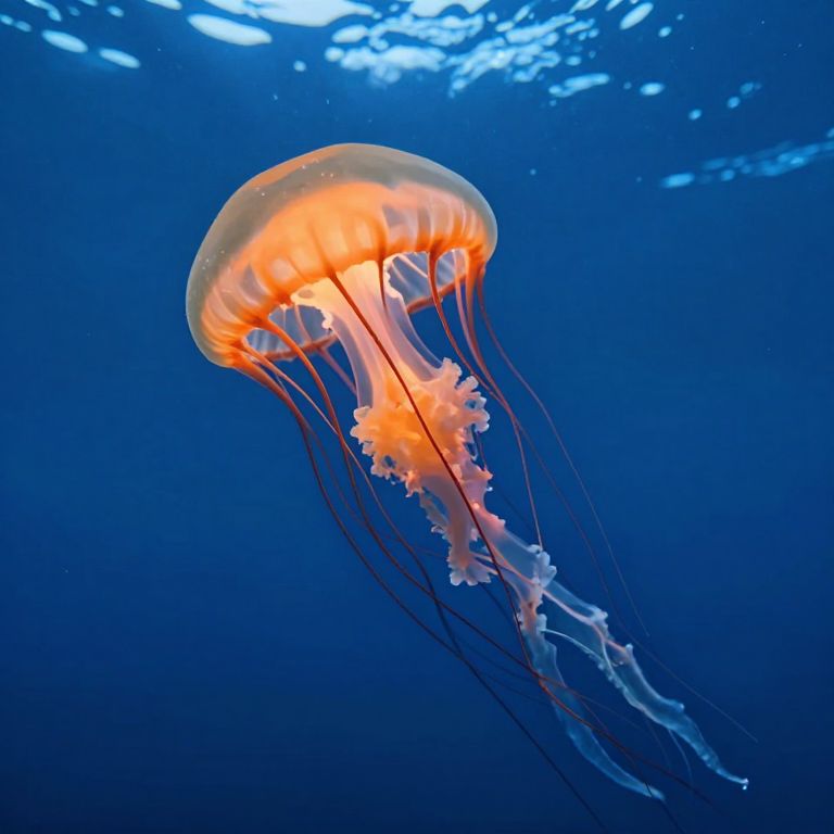 Glowing tendrils of a bioluminescent jellyfish gracefully float through the deep, azure waters, its translucent bell pulsating with radiant orange hues as sunlight filters through the ocean's surface above.