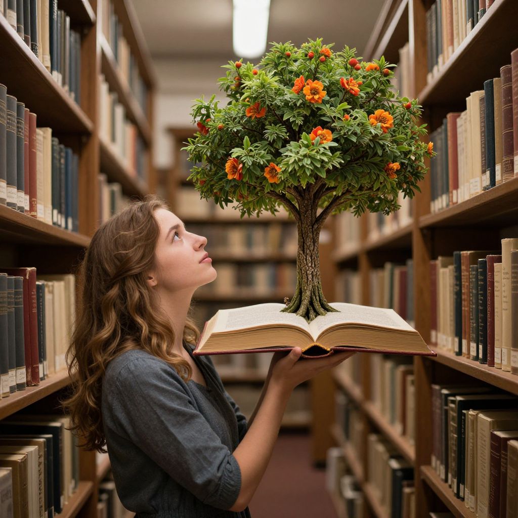 In a hushed library where knowledge whispers through ancient spines, a woman cradles a book while gazing up at a vibrant tree sprouting from its pages, symbolizing the boundless growth of imagination and the nurturing power of literature.