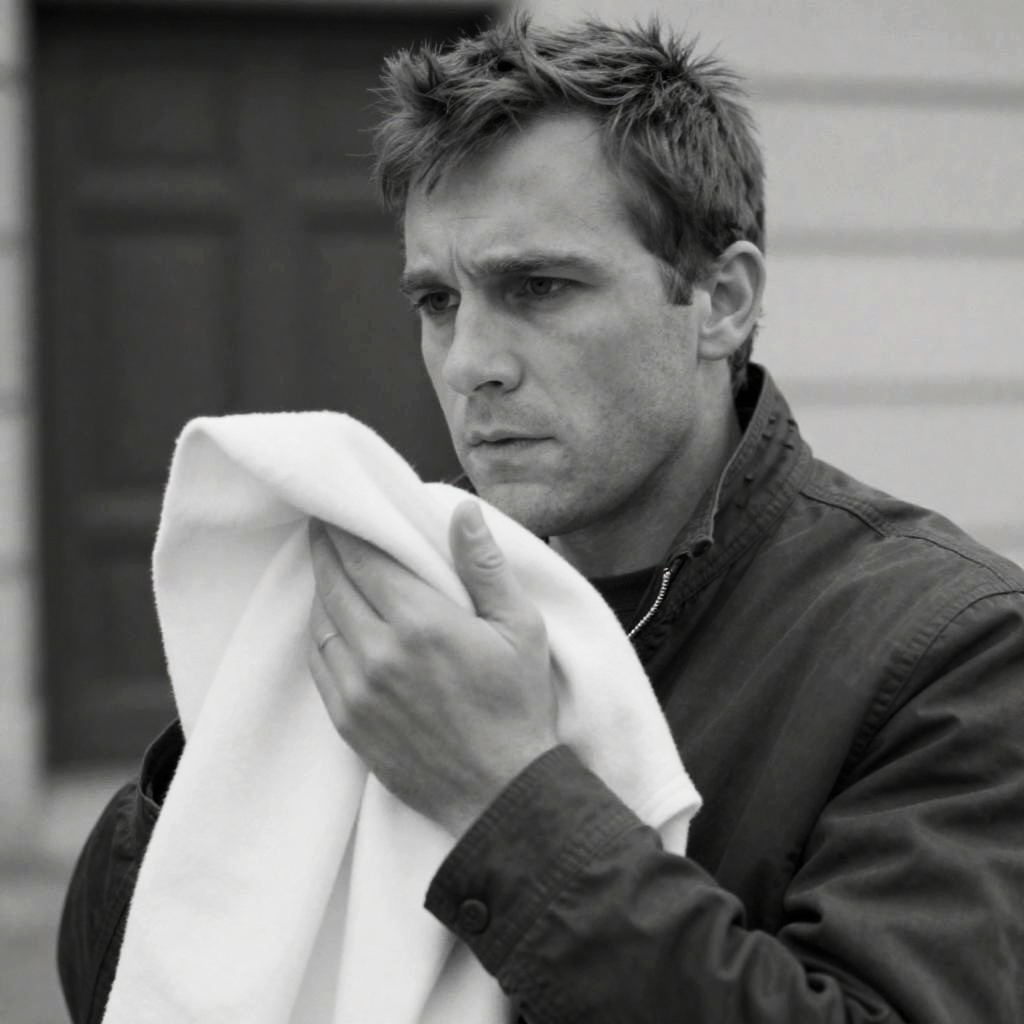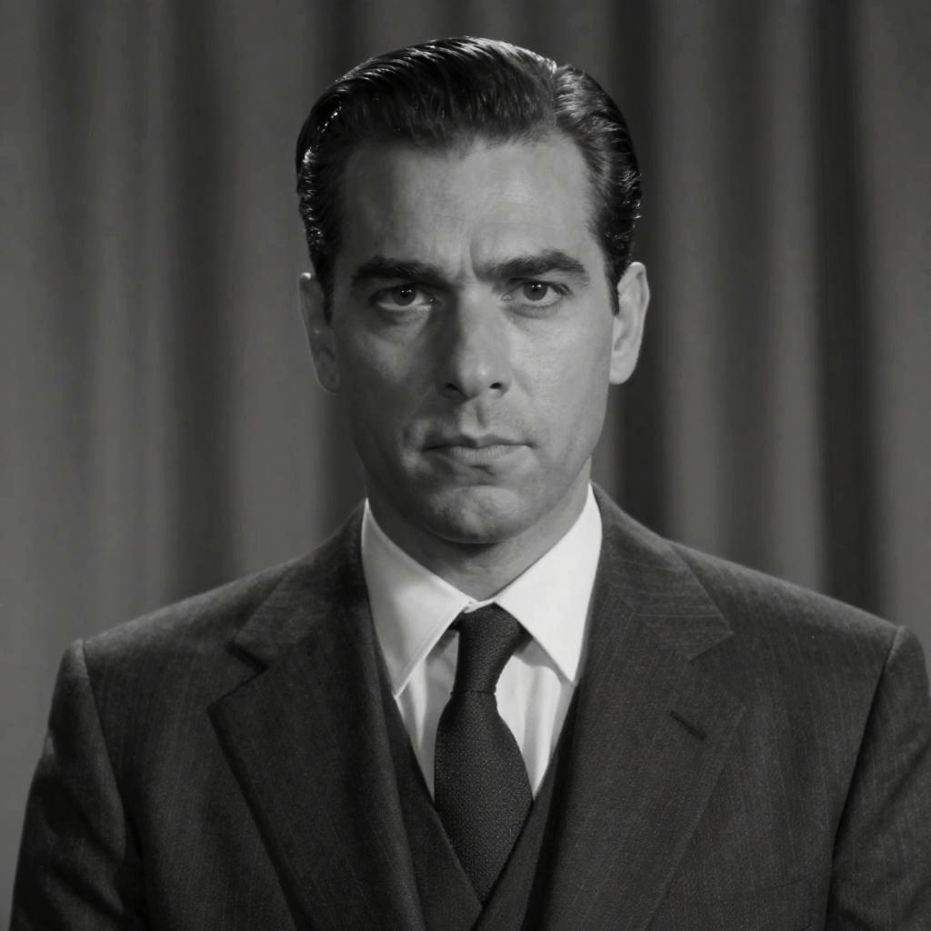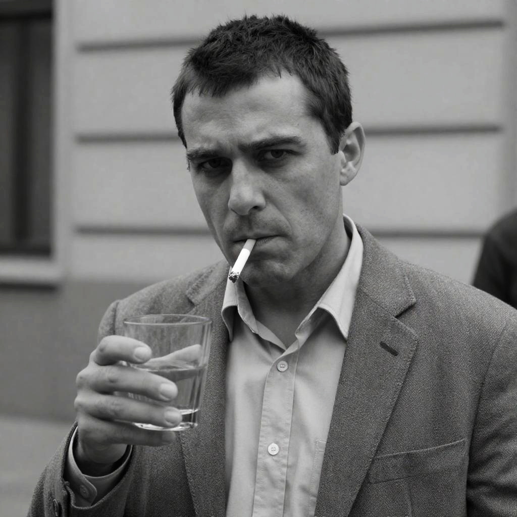 Black-and-white photograph of a man with short dark hair, a cigarette in his mouth, holding a glass in his right hand. He wears a ured blazer over a button-up shirt. His expression is intense and focused. Background is blurred.