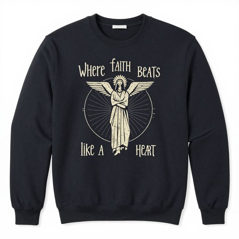 Where faith beats like a heart, this sweatshirt weaves a tapestry of devotion and hope, resonating with the timeless rhythm of spiritual connection and eternal love.