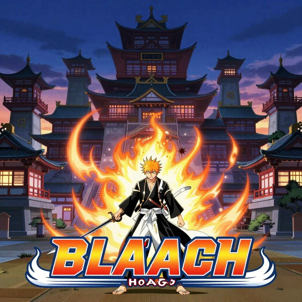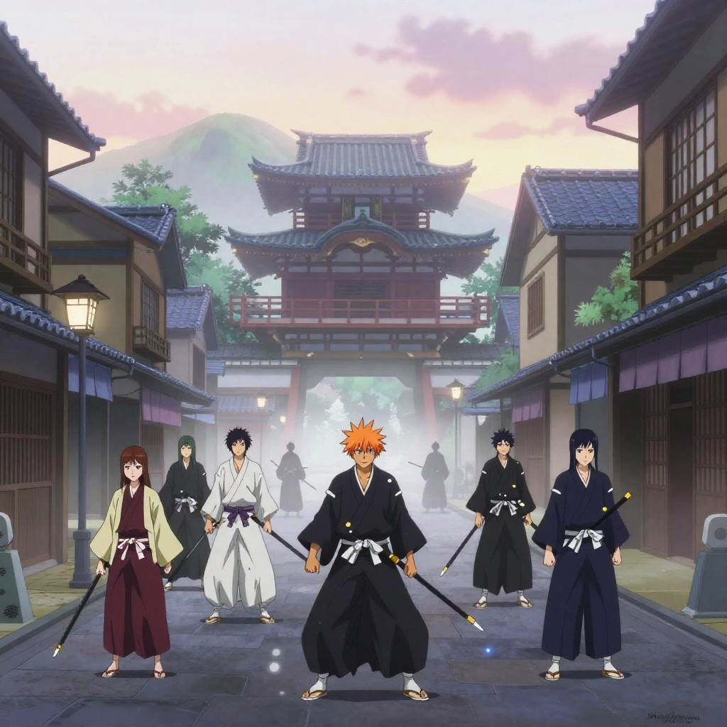 Bleach Seireitei at twilight, detailed anime style, vibrant colors, intricate architecture of the Soul Society's central district, spiritual energy glowing, dynamic atmosphere