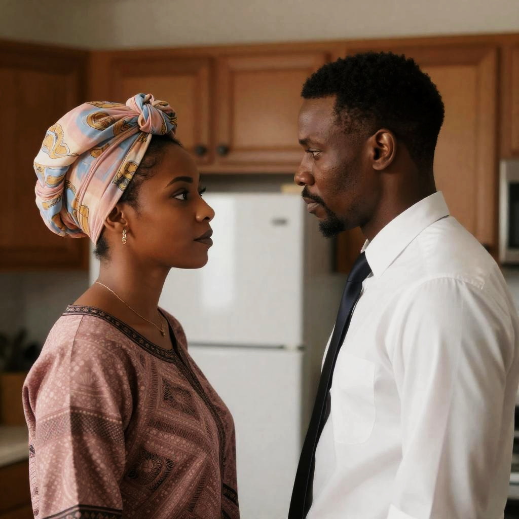 Photograph of two Black individuals in a dimly lit room. Man on left with short hair, gray hoodie, intense gaze. Woman on right with long ponytail, white fur-trimmed robe, looking to the side. Both standing close, facing each other. Warm light in background.