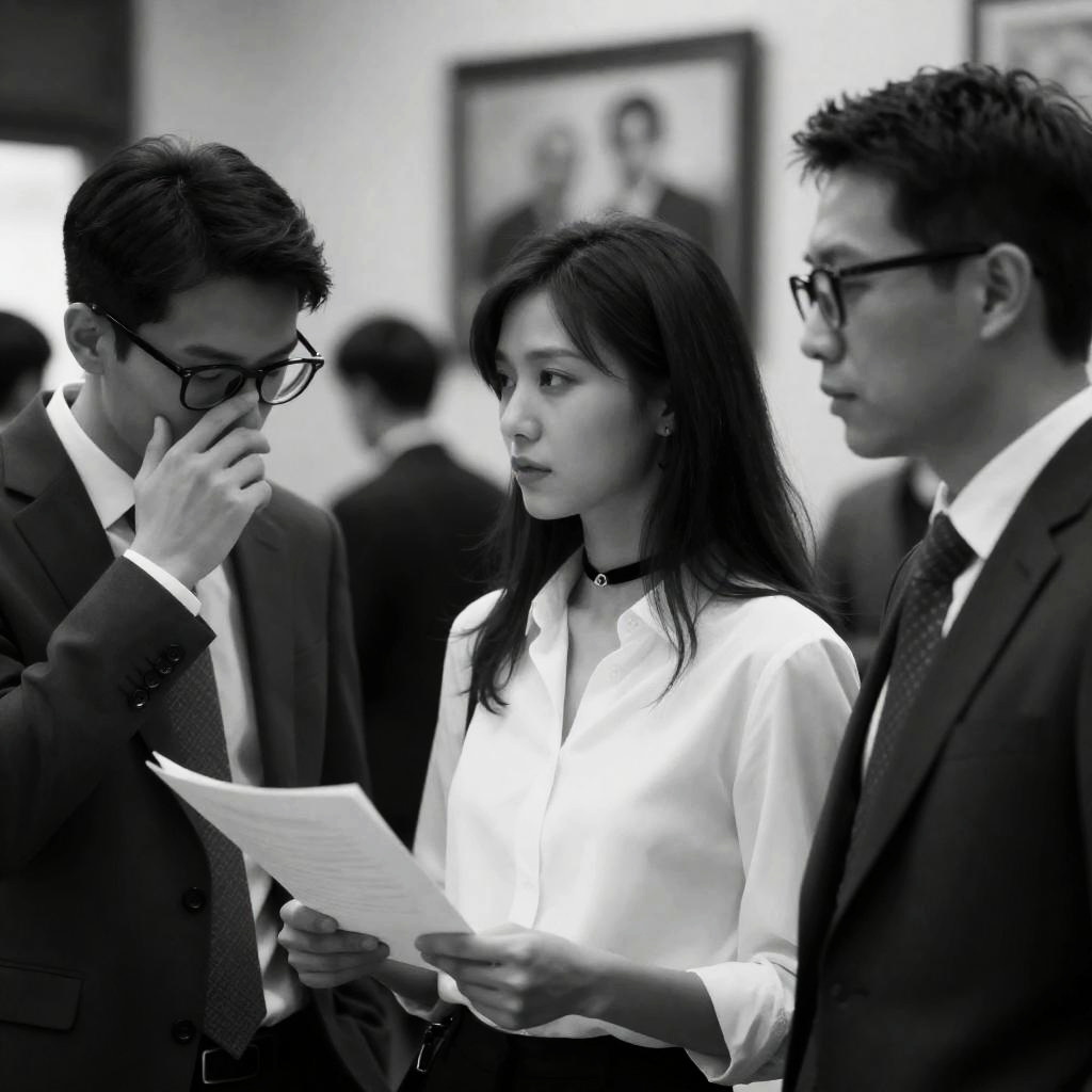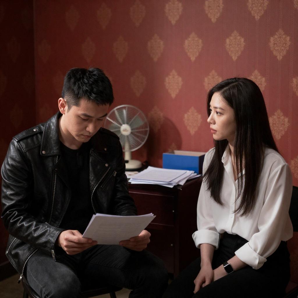 Photograph of a man and woman in a dimly lit room with red patterned wallpaper. The man, in a black leather jacket, sits on the left, focused on papers. The woman, with long dark hair, wears a white blouse and sits on the right, looking at him. A desk with papers, a fan, and a blue box is between them. Bright light from an unseen source illuminates the woman's face.
