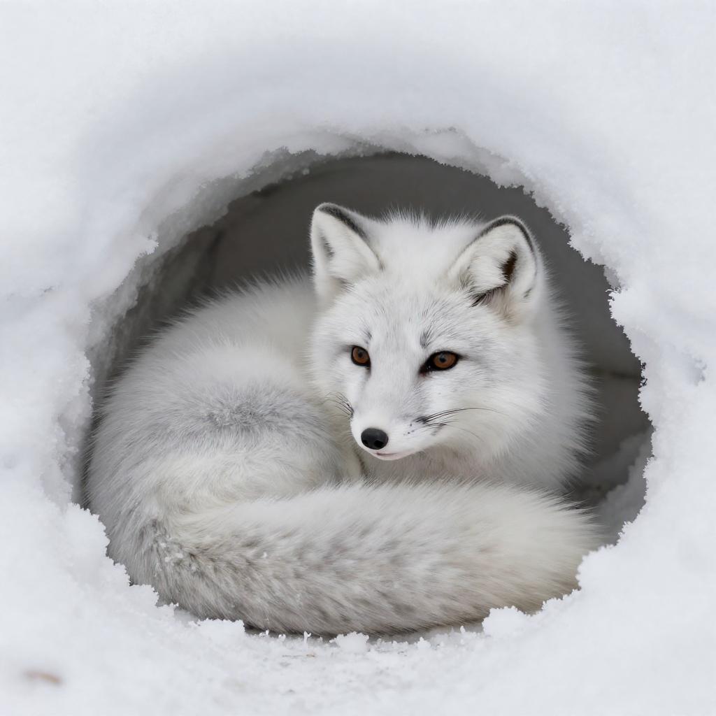 Photograph of a small, fluffy, white arctic fox curled up tightly in a snow-covered den. The fox's thick fur is light gray with white accents, and its head is nestled between its curled body and tail. The snow around the den is pristine and white, creating a stark contrast with the fox's fur.