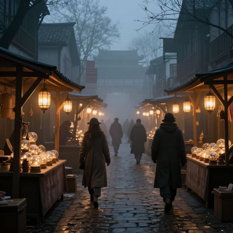 An atmospheric 3D-rendered scene depicts a misty marketplace lined with traditional wooden stalls, illuminated by warm, glowing lanterns that cast a vintage ambiance over rows of glass orbs filled with flickering lights, symbolizing forgotten memories, as figures in long coats walk through the cobblestone street, evoking a sense of nostalgia and mystery.