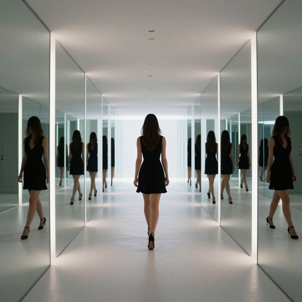 A sleek, modern corridor bathed in high-definition, symmetrical lighting features a woman in a black dress walking away, her silhouette mirrored endlessly by a choir of levitating, geometrically arranged mirrors, each reflecting alternate perspectives of her journey through a minimalist, digital-rendered space.