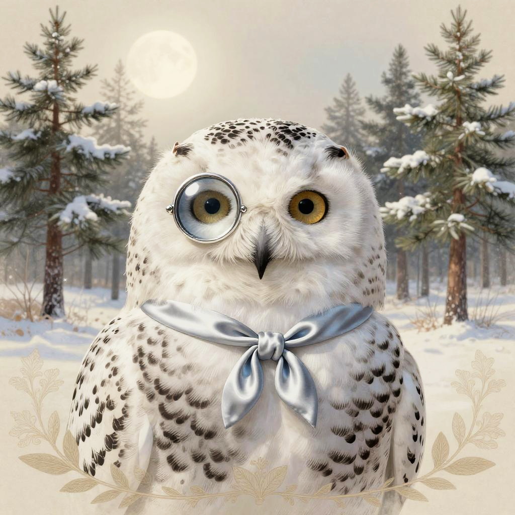 A curious snowy owl wearing a delicate silver monocle and silk cravat, set in a frost-kissed pine grove under pale moonlight, vintage illustration aesthetic with delicate linework and fine crosshatching, muted warm palette on a soft cream backdrop, ornate botanical detailing, gentle and charming atmosphere, soft rim lighting, subtle paper grain texture, balanced and symmetrical composition, slight vignette, natural bokeh sparkle, ultra clean edges, high fidelity details