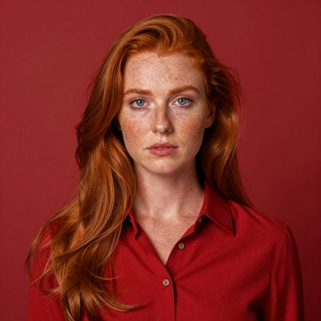 Photograph of a young woman with long red hair and fair skin, wearing a red button-up shirt. She stands against a solid red background. Her face is neutral, with light makeup and visible freckles. She gazes slightly to the right. Her hair is slightly wavy, cascading over her right shoulder. She wears no other visible accessories. Her shirt has a pointed collar and is buttoned up. She is centered in the frame.