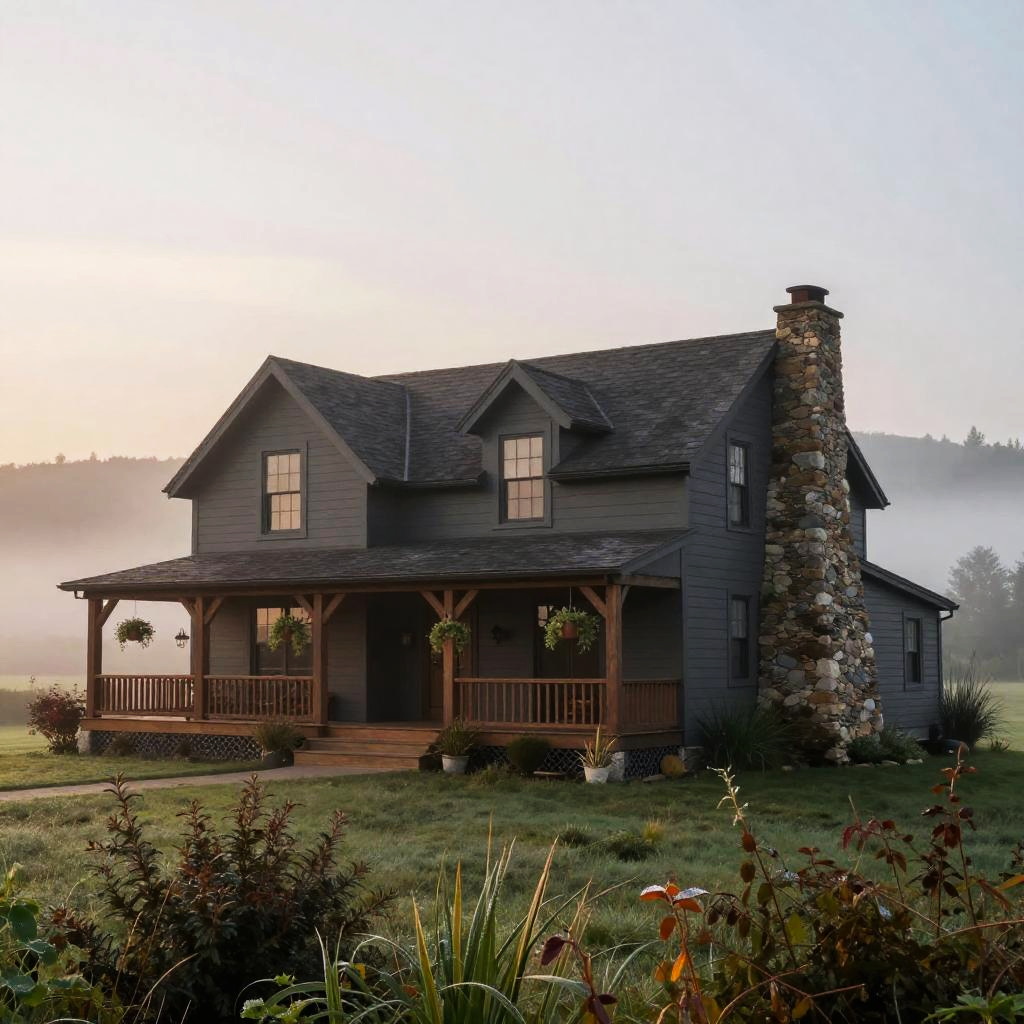Rustic mansard roof chain with weathered patina on an old countryside mansion, surrounded by lush greenery, autumn colors, detailed textures of wood and metal, warm golden hour lighting, serene peaceful atmosphere