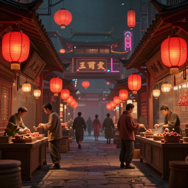 An atmospheric 3D-rendered scene depicts a traditional Asian marketplace illuminated by glowing red lanterns, evoking a vintage, cyberpunk-inspired ambiance where ancient wisdom and modern technology converge.