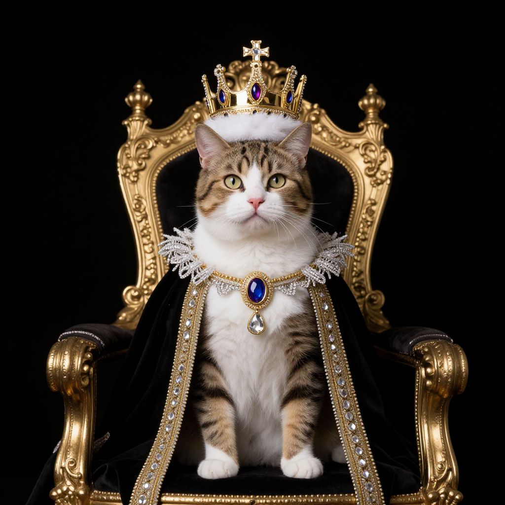 "Asymmetry The Purrfect Portrait: A parody of a classic royal portrait, with an elegantly dressed cat seated on a grandiose throne, adorned with jewels and a crown black background, Grandiose"