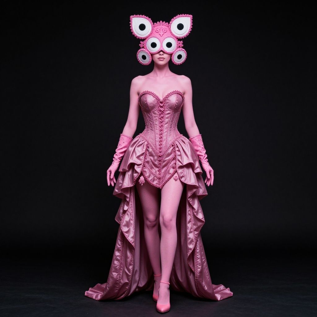 Photograph of a woman in a surreal, pink-themed costume. She wears a strapless, corset-style dress with intricate, ruffled textures and a long, flowing skirt. Her head is adorned with a pink, cat-like mask featuring large, white eyes with dark pupils. She has pink, fingerless gloves and pink high heels. The background is solid black, making her vibrant pink outfit stand out. The overall style is avant-garde and theatrical, with a strong emphasis on bold color and unusual design elements. The woman's skin tone is light, and she stands confidently, facing the camera.