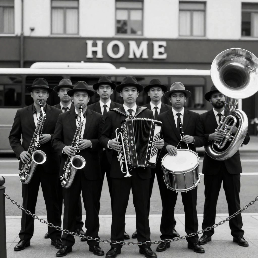 Black-and-white photograph of seven male musicians in suits and hats standing in front of a hotel. Each musician holds a different instrument: saxophone, trumpet, accordion, clarinet, drums, tuba, and sousaphone. Hotel sign with "HOME" visible in background. Musicians wear serious expressions. Chain barrier in foreground. Background includes a bus and building. Musicians stand in a row, facing forward.
