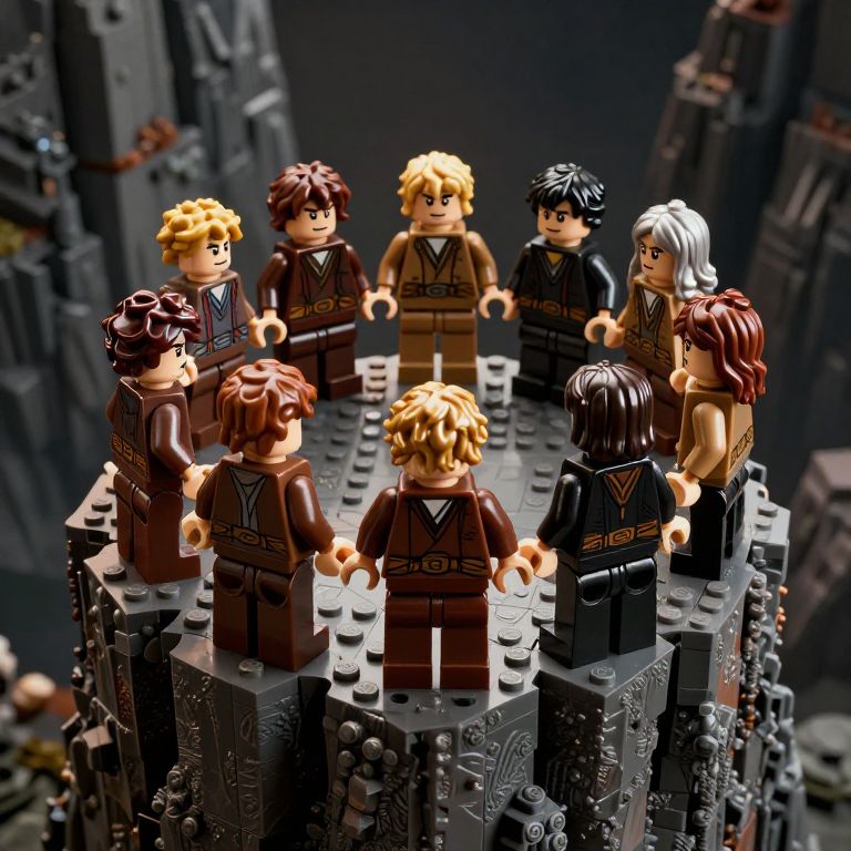 The image depicts a highly detailed and dynamic composition featuring eight Lego characters from the Fellowship of the Rings, holding hands as they hang off the edge of a cliff. The characters are arranged in a semi-circle, with their heads facing outward and their bodies facing inward, creating a sense of unity and camaraderie. The cliff is intricately carved with jagged edges and a textured surface, adding to the realism of the scene. The lighting is dramatic, with a strong light source illuminating the characters from behind, casting deep shadows and highlighting the contours of their figures. The overall composition is balanced and well-framed, with the characters centrally positioned and the cliff providing a natural frame for the scene. The colors are rich and varied, with the characters' outfits in shades of brown, black, and gold, contrasting against the dark, rocky background. The image is rendered in 8K resolution, with hyper-detailed textures and lighting effects that enhance the realism and depth of the scene.